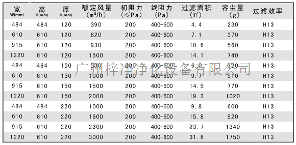 有隔板高效過濾器規格尺寸參數: