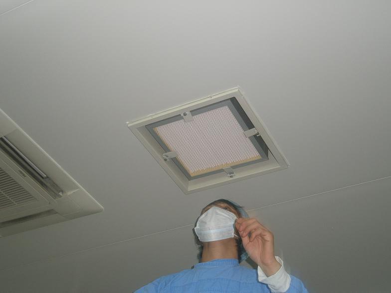 5、安裝高效空氣過濾器時用手托住四周邊框,慢慢移進送風口內。不能用手和頭頂住濾料,以免濾料斷裂,影響過濾效率。