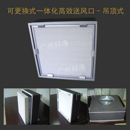 可更換式一體化高效送風(fēng)口:由靜壓箱和無隔板高效過濾器組成,采用鋁型材做靜壓箱,箱體內(nèi)置無隔板高效過濾器。該送風(fēng)口具有通風(fēng)性強、外形美觀、安裝更換方便、維護簡單、投資少、重量輕、厚度薄、過濾效率高等優(yōu)點。
