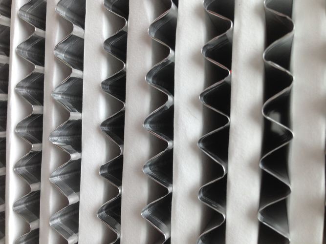 高溫高效過濾器濾材兩面180度翻折,形成鍥形褶層。高溫高效過濾器濾料折彎時有兩道壓痕,使其在隔板的尾端處形成鍥形盒式摺層,鍥形盒式褶層可以防止濾料破損。有些高溫高效過濾器生產商采用了單壓痕或滾痕式濾料褶層,甚至簡單地人工折紙,在這種惰況下,濾料很容易被波紋形隔板尖銳的折頂損壞。或在過多搬運過程中損壞濾紙。